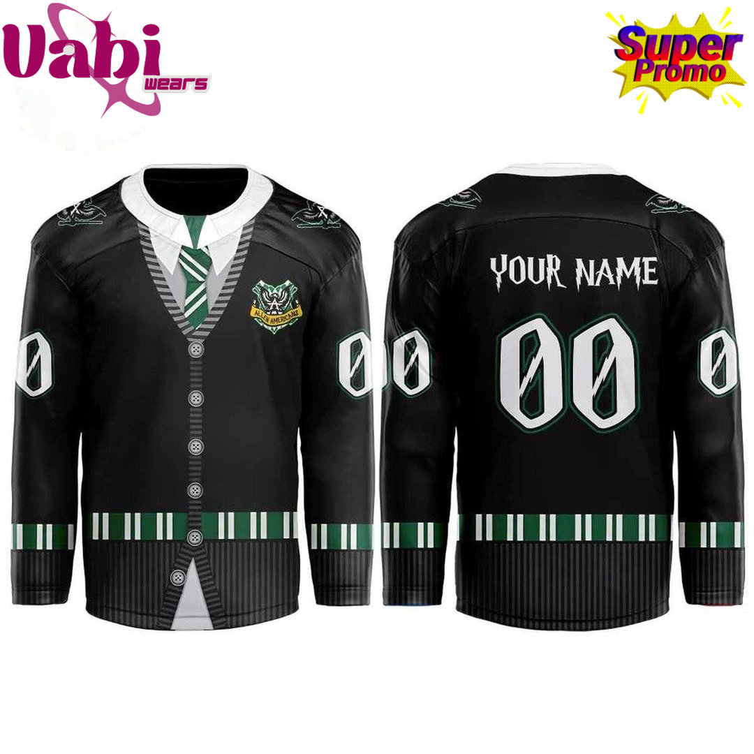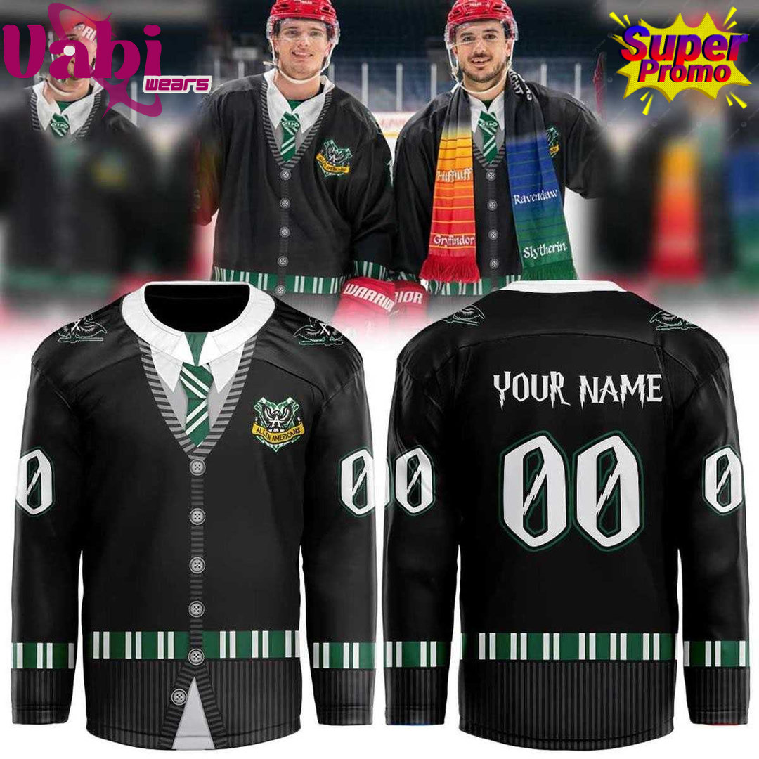 This sleek black cardigan hockey jersey features a classic button-up front with a white collar and green striped detailing throughout. The chest proudly displays the Allen Americans crest with a wizard-inspired twist, while the sleeves and hem feature bold green and white stripes for a polished, Hogwarts-meets-hockey look.