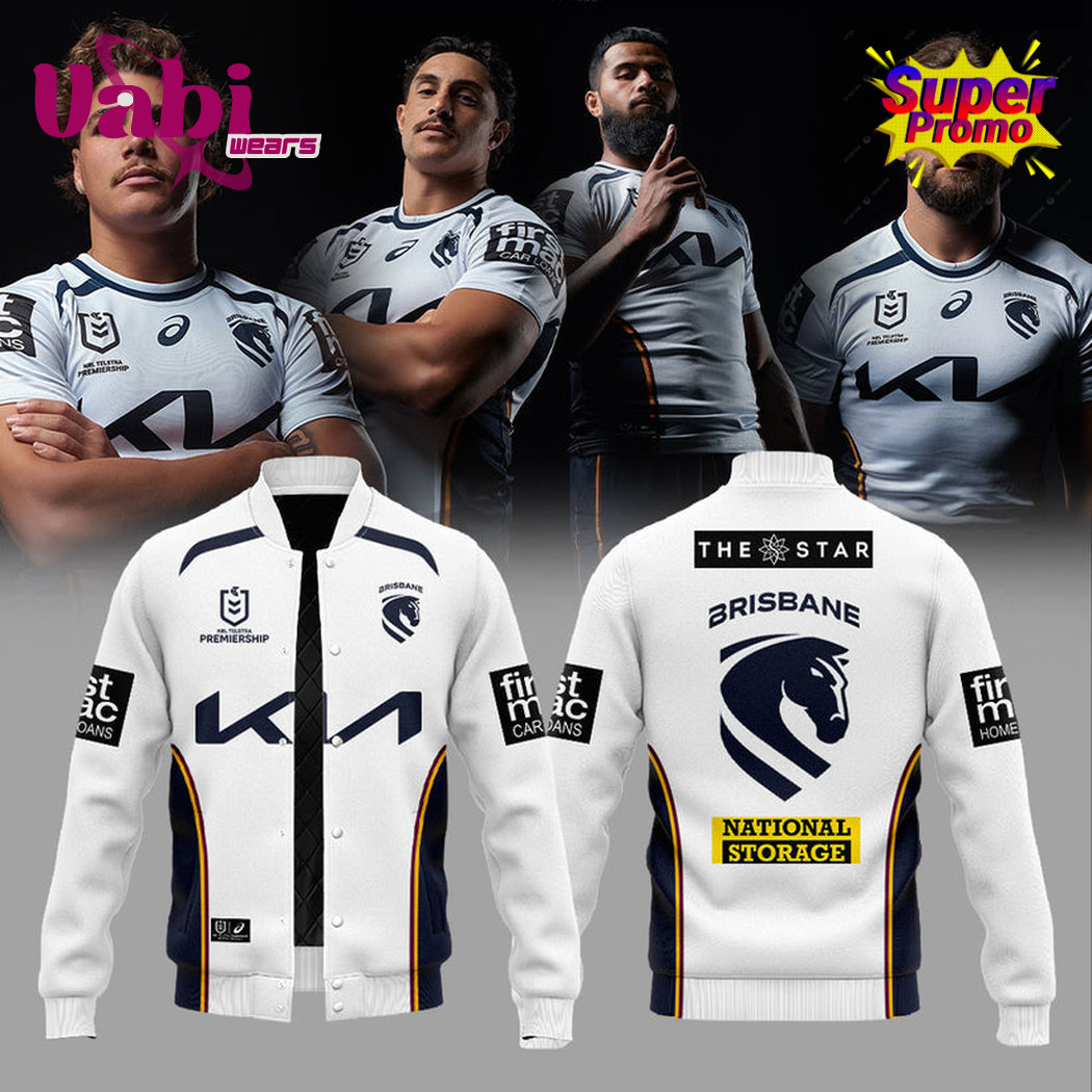 This clean white baseball jacket features classic black and orange heritage striping on the collar, cuffs, and hem, paired with the legendary 2006-era Broncos branding. The front showcases the bold “K1” sponsor logo and the official NRL shield, while the back proudly displays “THE STAR BRISBANE” above the famous Broncos horse-head emblem and a “NATIONAL CHAMPIONS” banner.