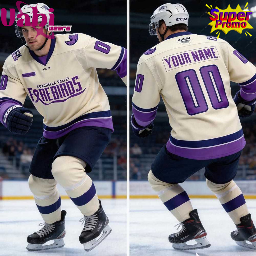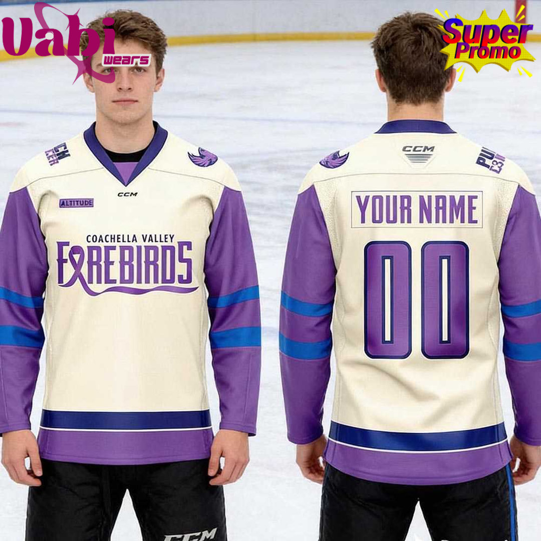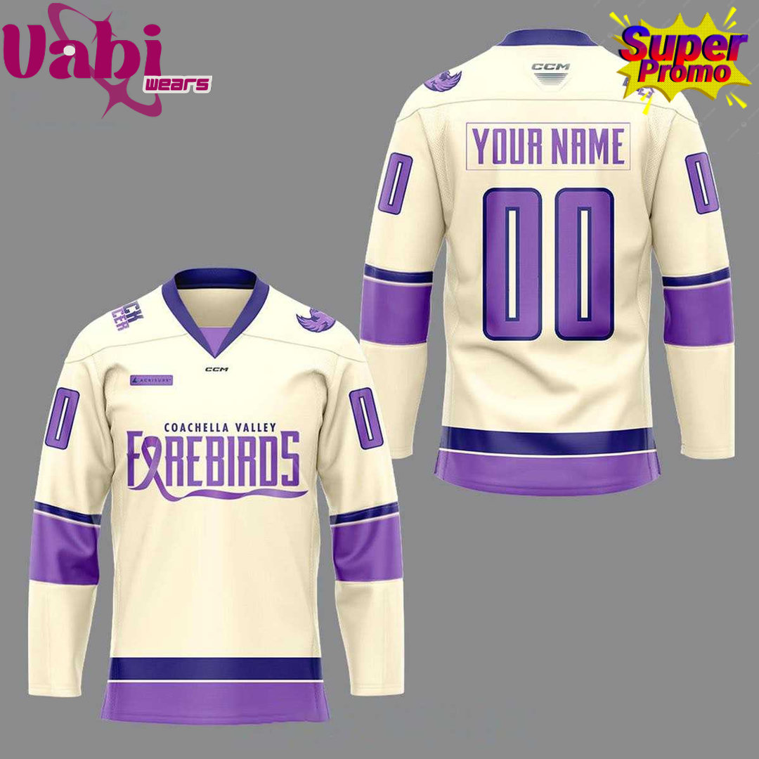This clean cream-colored jersey features bold purple accents on the shoulders, sleeves, and hem, creating a striking and meaningful design. The chest proudly displays “Coachella Valley Firebirds” in large purple lettering with a subtle lavender ribbon detail incorporated into the logo, symbolizing cancer awareness.