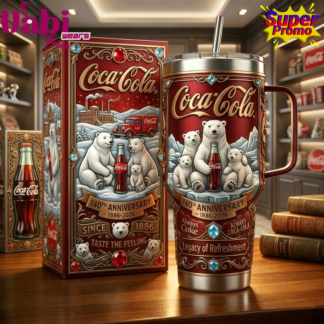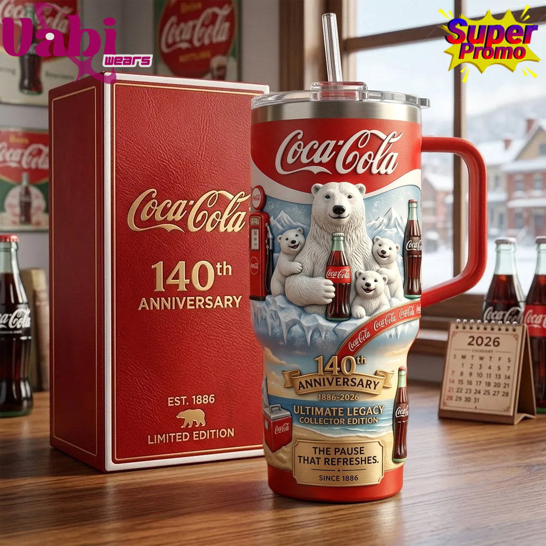 The tumbler showcases a cheerful family of Polar Bears enjoying ice-cold Coca-Cola bottles against a snowy mountain backdrop. Vibrant red and white graphics wrap around the cup, highlighting the “140th Anniversary – Ultimate Edition” badge and the proud declaration “The Pause That Refreshes – Since 1886”. Classic Coca-Cola script and vintage-inspired elements create a nostalgic yet modern collector’s piece that honors the brand’s legendary journey since 1886.