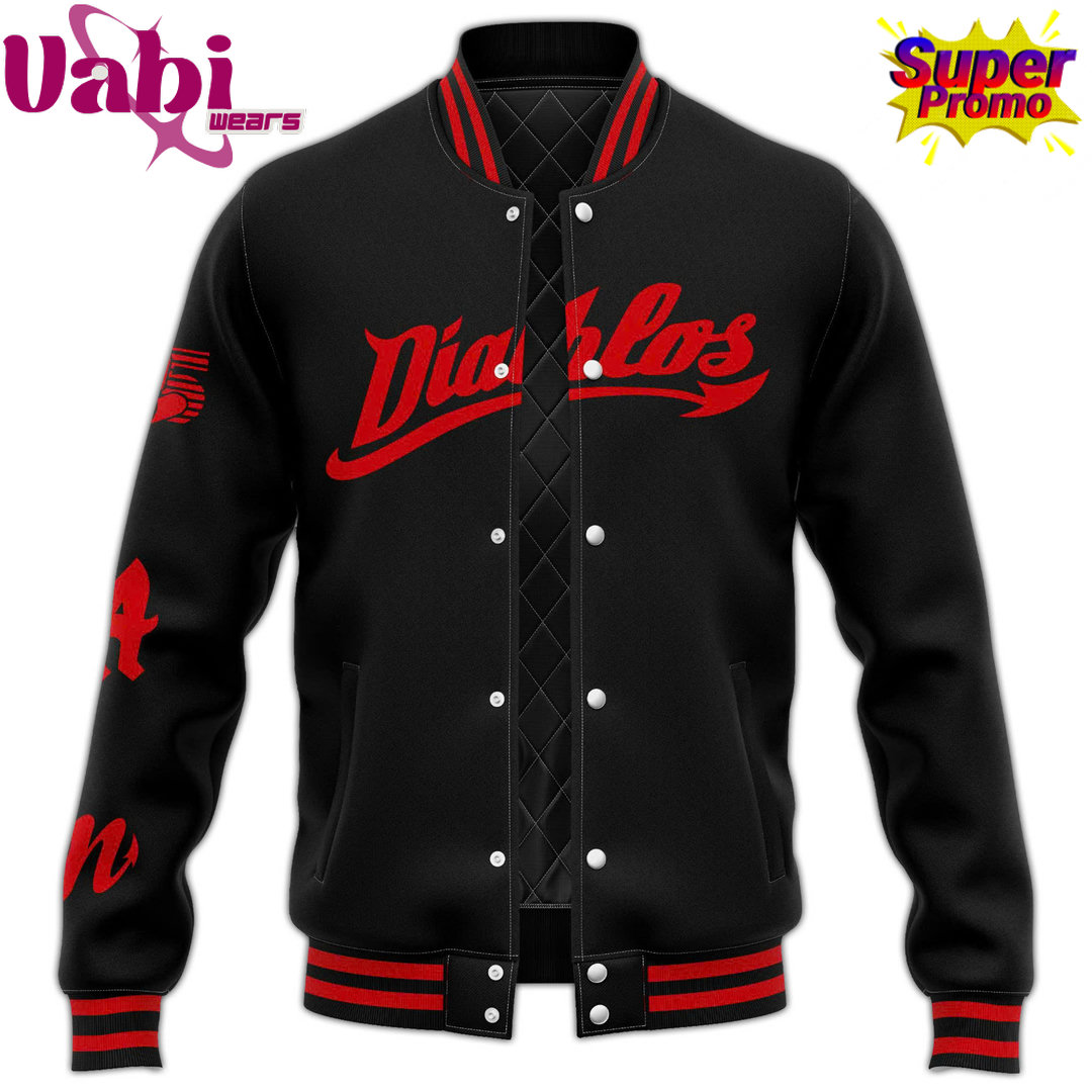This premium black varsity-style jacket features striking red accents on the collar, cuffs, and hem, giving it an aggressive, fiery look that perfectly matches the Diablos spirit. The front showcases the iconic “Diablos” script in bold, flaming red lettering across the chest, while the left sleeve carries a smaller devil logo for extra detail.