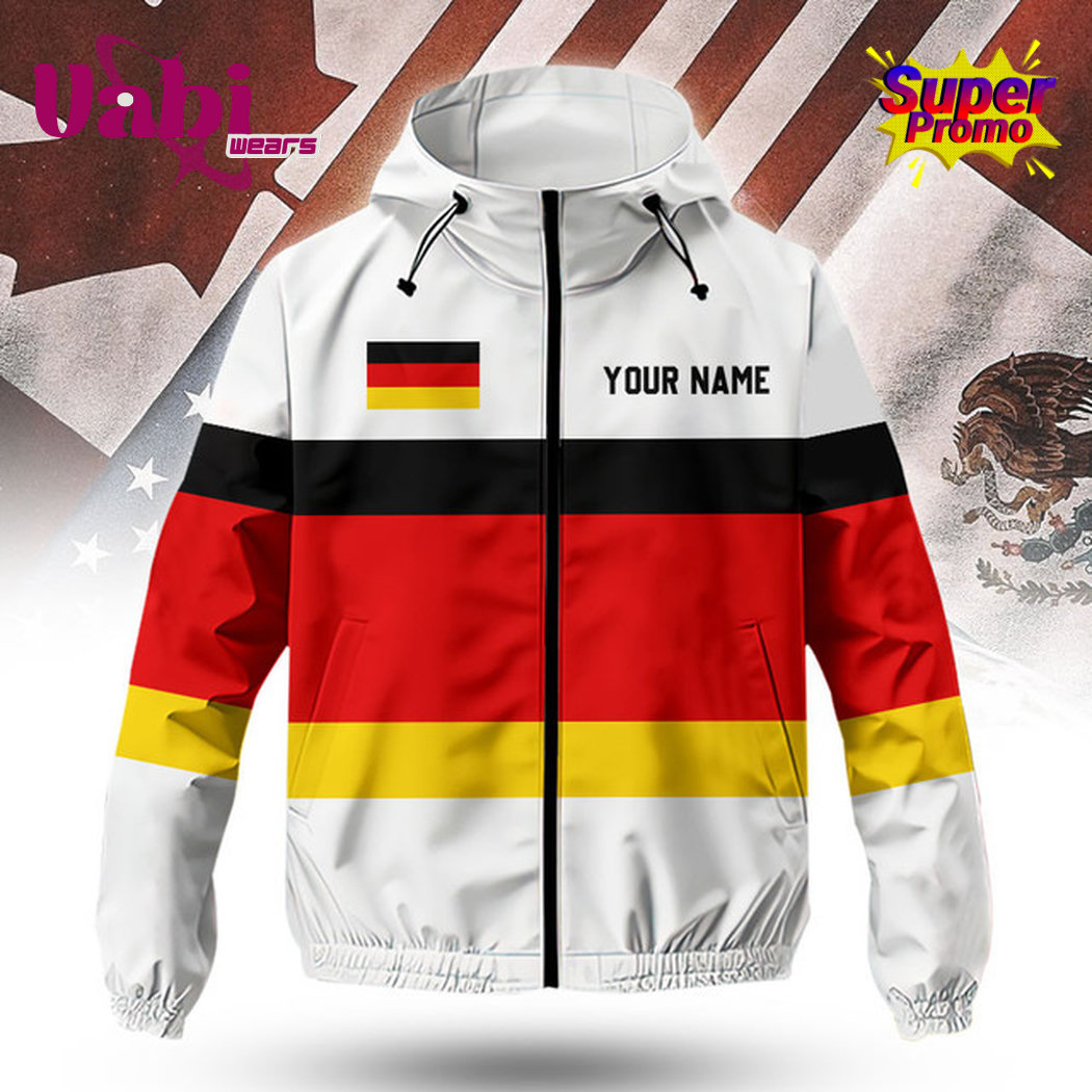 The front features a sleek white base with bold horizontal stripes in Germany’s national flag colors: black, red, and yellow. A high-quality printed German flag patch sits proudly on the left chest, while the right chest offers full personalization with “YOUR NAME” in crisp lettering. The full-zip closure, adjustable hood with drawstrings, and elasticated cuffs ensure a comfortable, wind-resistant fit that keeps you protected from light rain and chilly stadium breezes.