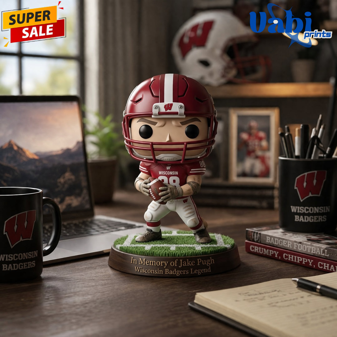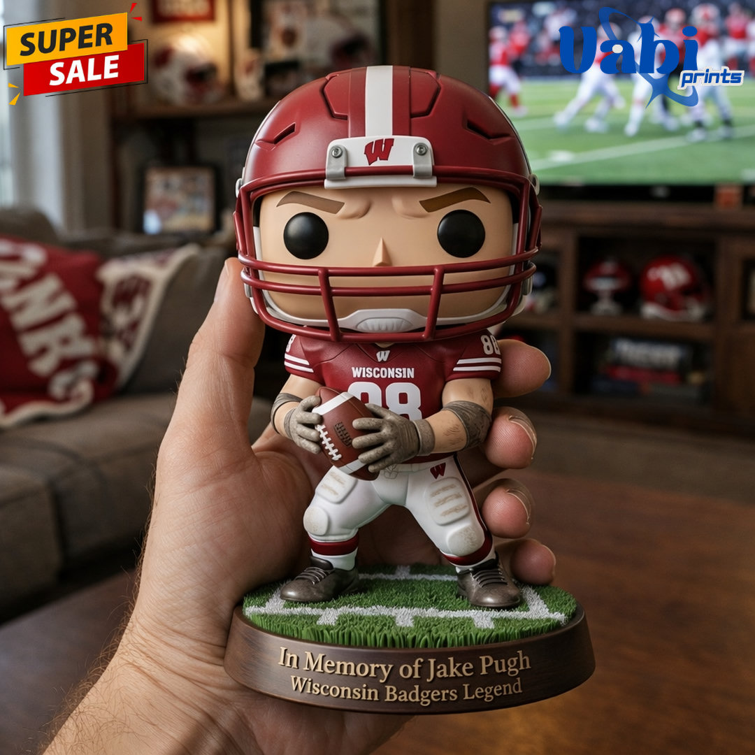 The figure features Jake Pugh in his iconic red Wisconsin Badgers helmet and uniform, proudly holding the football in a powerful running pose. Standing on a custom green football field base, the figure includes the touching inscription: “In Memory of Jake Pugh – Wisconsin Badgers Legend”. The premium collector’s box highlights the “Memorial Edition” with a limited edition numbered sticker, making this a must-have piece for fans and collectors.