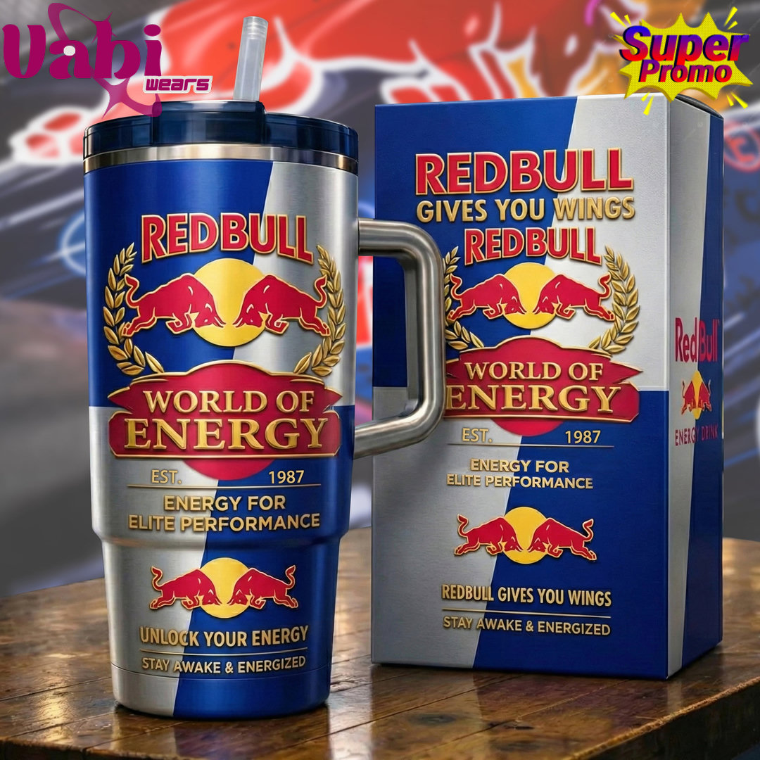 The tumbler features a striking deep blue finish with vibrant gold and red accents. At the center sits the classic Red Bull logo framed by a golden laurel wreath, with the powerful banner “WORLD OF ENERGY” proudly displayed above. Below, the text reads “1987 – ENERGY FOR ELITE PERFORMANCE” and “UNLOCK YOUR ENERGY – AWAKE & ENERGIZED”, paying homage to Red Bull’s founding year and its mission to give wings to those who push limits.