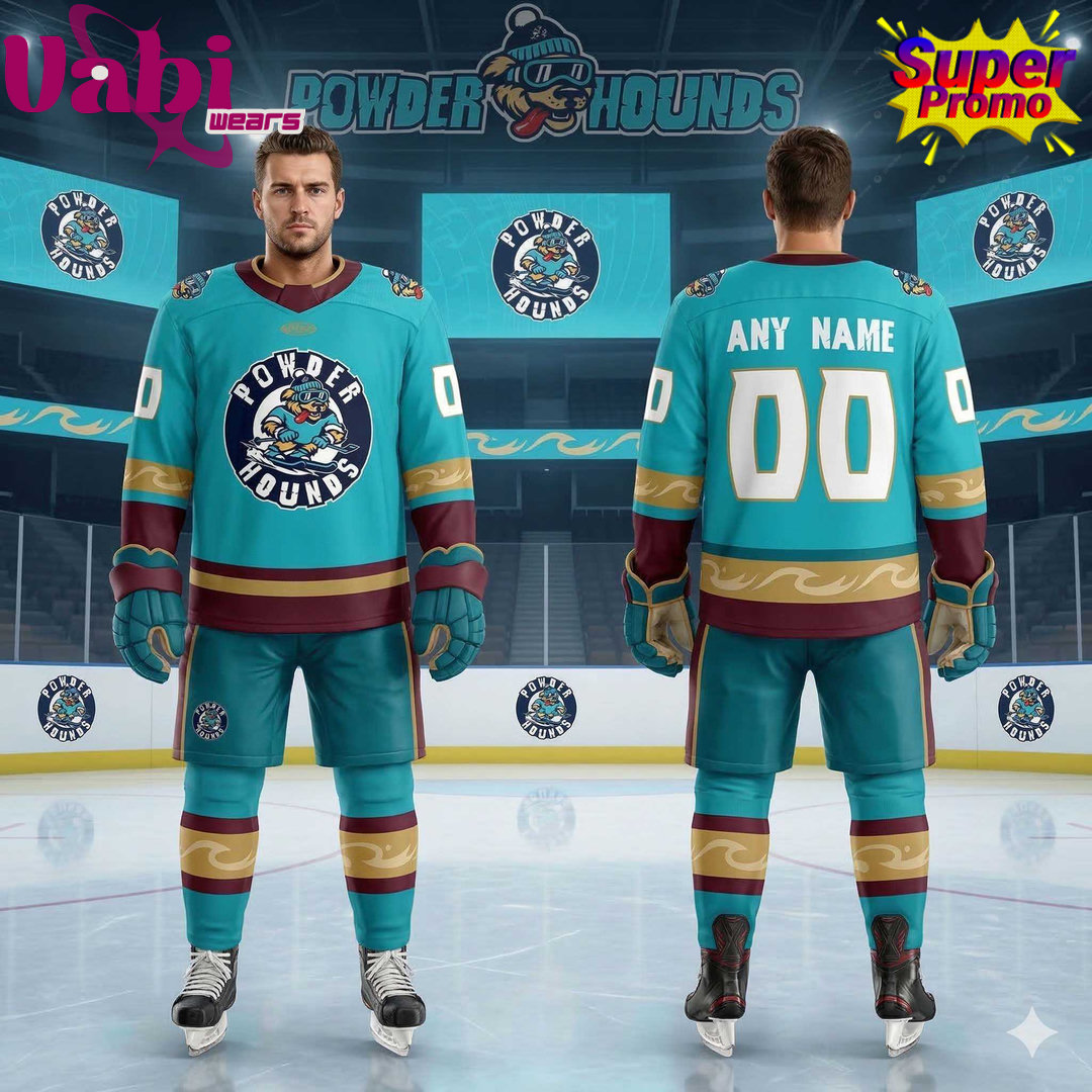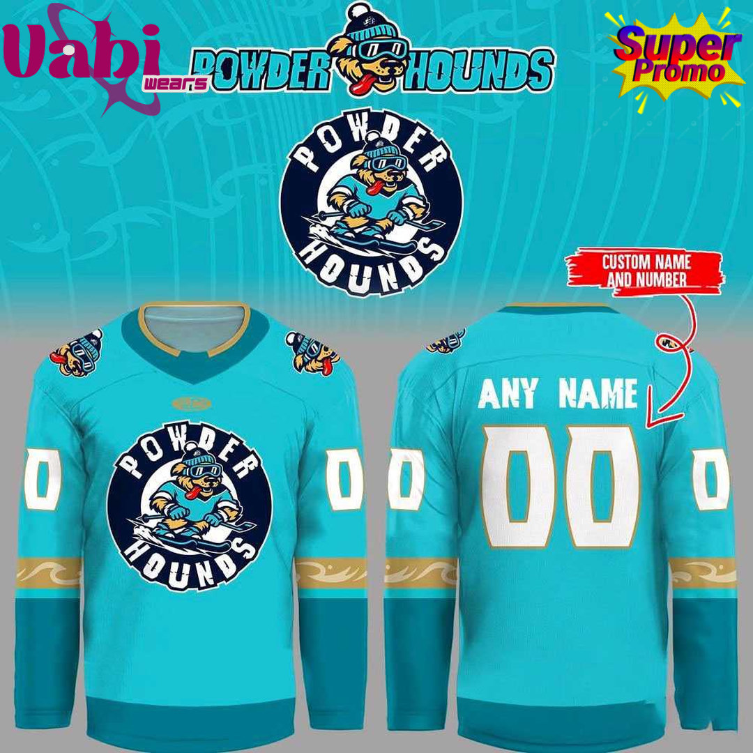 This vibrant turquoise jersey features the custom “Powder Hounds” circular logo on the chest — a cool blue-toned mascot dog decked out in ski goggles and winter gear. The design includes stylish gold accents on the collar and sleeve cuffs, along with full customization options for name and number on the back in bold white lettering.