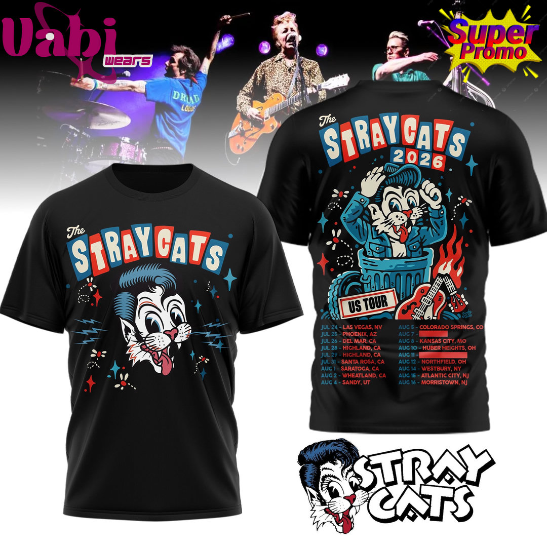 This bold black t-shirt features a fierce Stray Cats graphic with their iconic cat logo on the front, while the back delivers full tour vibes with “STRAY CATS 2026”, a large concert design, and the complete 2026 tour dates.